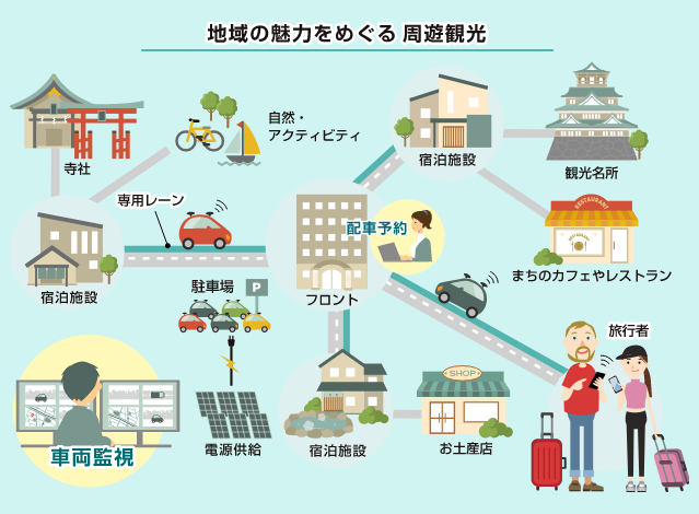 旅行者が行きたい場所に電車やバスがなくても、スマートフォンで気軽に乗れる自動運転があれば、新しい観光名所がSNSを通じて発信されます。