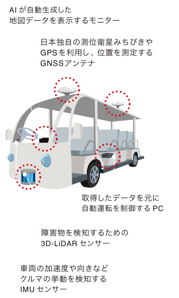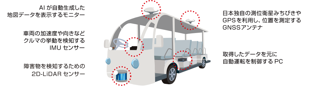 - 本システムは、3Dマップやカメラを使用しないため、路面の白線が見えなくても位置情報が正確に受信できる場所であれば雨天や雪道でも走行が可能です。
